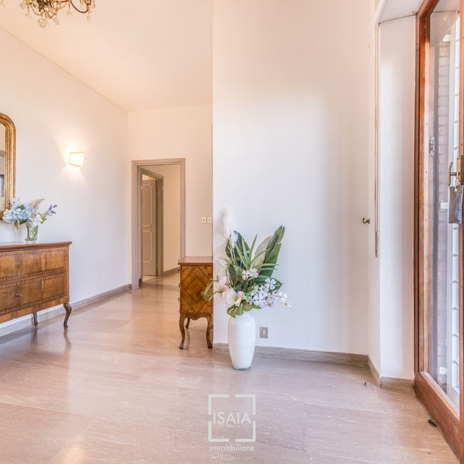 L'immobile di grandi dimensioni (oltre 230 metri interni più terrazzi) è composto da ingresso con camera guardaroba, salone triplo comprensivo di zona pranzo e grande terrazzo con affaccio panoramico in direzione della Città del Vaticano ed il “Cupolone”, tre camere da letto padronali, due bagni uno con vasca ed uno con doccia, camera studio, oltre a zona di servizio con spazio di lavoro, cucina abitabile, bagnetto, cameretta, ripostiglio, disimpegno con zona armadi ed ingresso di secondario. Completano la proprietà un grande posto auto coperto ed una cantina al piano seminterrato con accesso tramite ascensore.